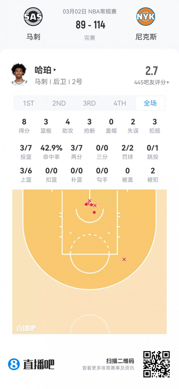 马刺榜眼秀哈珀 登场22.1分钟